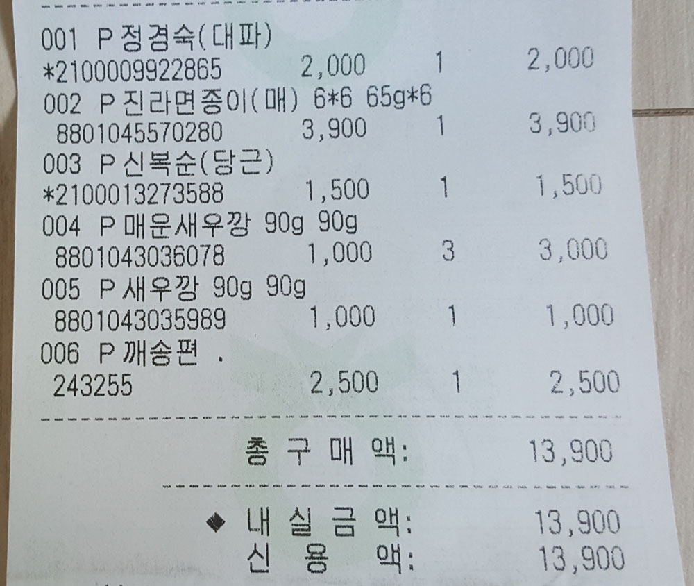 농심 매운 새우깡 90g : 1,000원 × 3봉지 = 3,000원