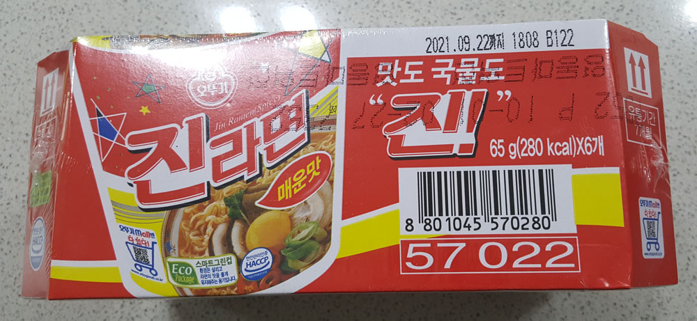 유통기한 : 앞면 또는 옆면 표시일까지 / 2021.09.22까지 1808 B122 (컵라면의 유통기간은 7개월입니다.)