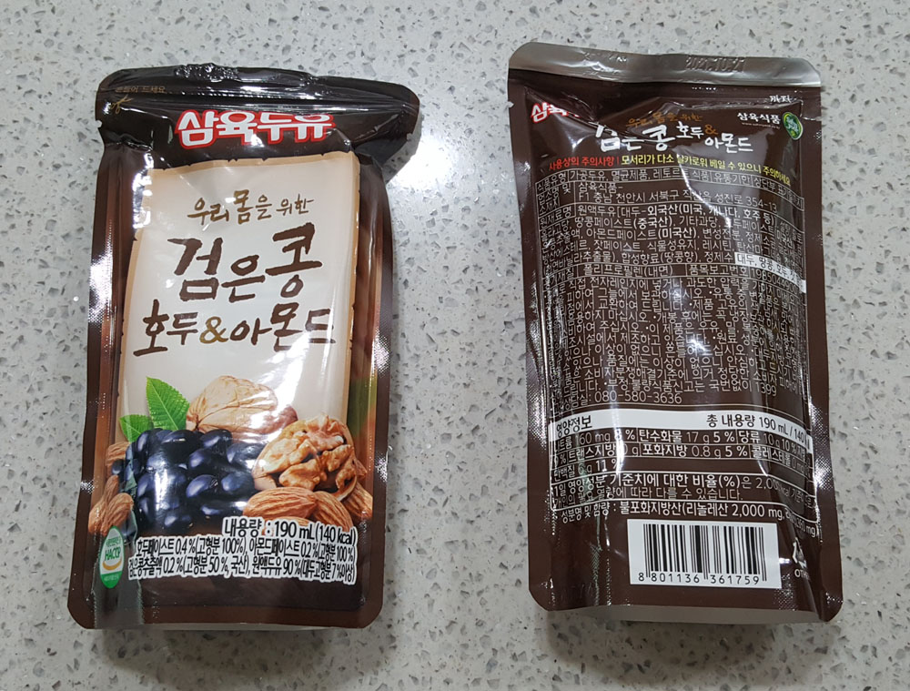 음료를 담은 용기가 정식품의 베지밀(두유)과 다른 파우치 형태로 되어 있었습니다.