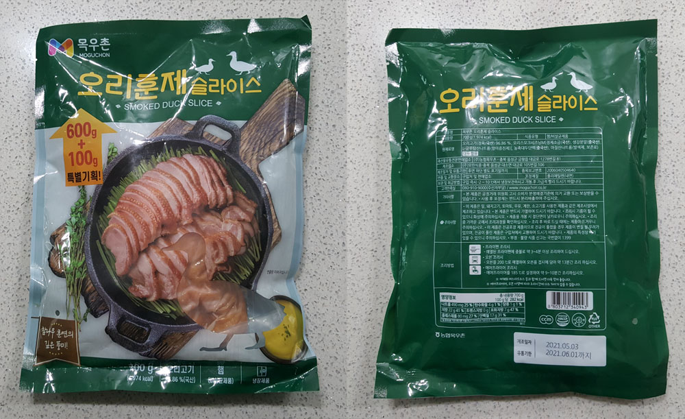 2021년 5월 13일 영동농협 하나로마트에서 10,500원에 구매한 목우촌 오리훈제 슬라이스 600g + 100g는 모란식품에서 제조한 오리훈제 슬라이스로, 4월에 구매해서 먹은 영농조합법인 비엔푸드의 목우촌 오리훈제 슬라이스보다 껍질이 더 많고 두꺼워 보였으며 맛도 더 없게 느껴졌습니다.