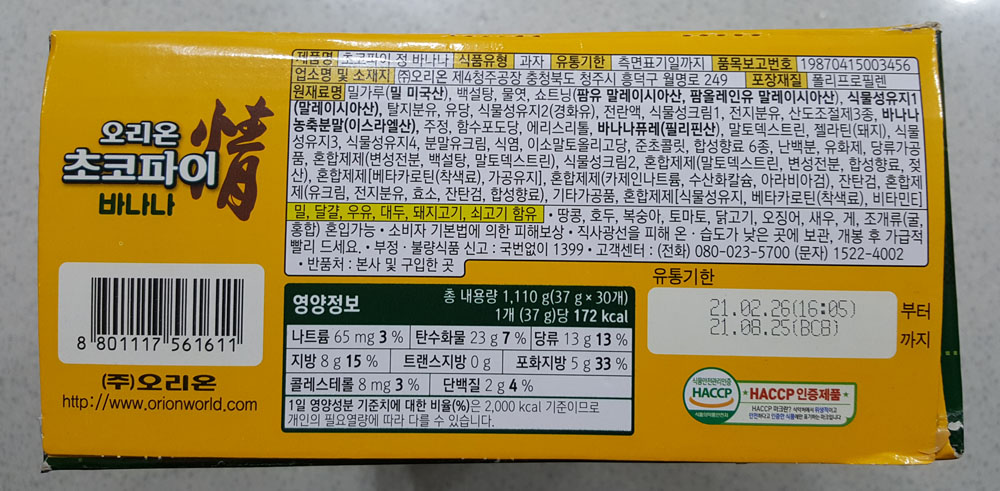 오리온 초코파이 정 바나나 (30개입) 개당 중량, 칼로리, 영양정보, 오리온 초코파이 정 바나나 원재료 및 유통기한