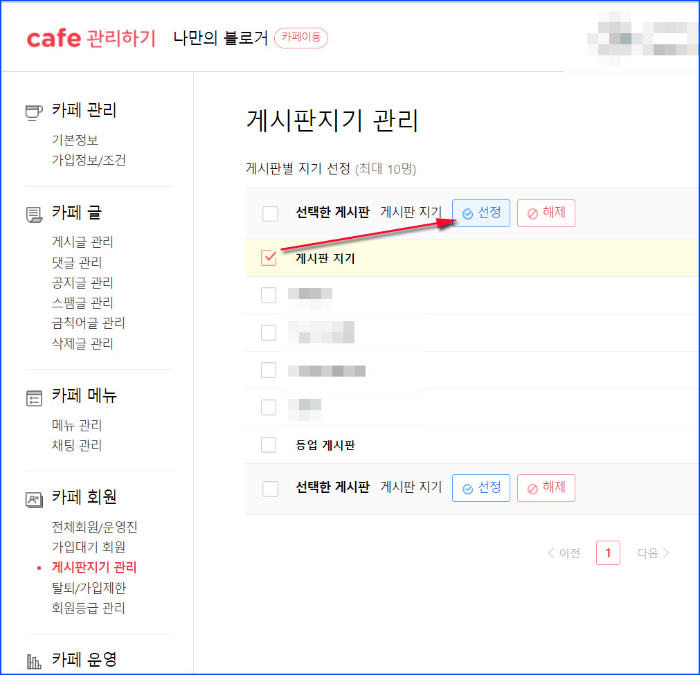 3. 게시판지기를 선정할 카페 게시판을 선택한 후