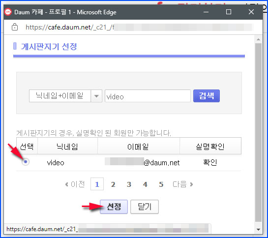 4. 게시판지기 선정 팝업창에서