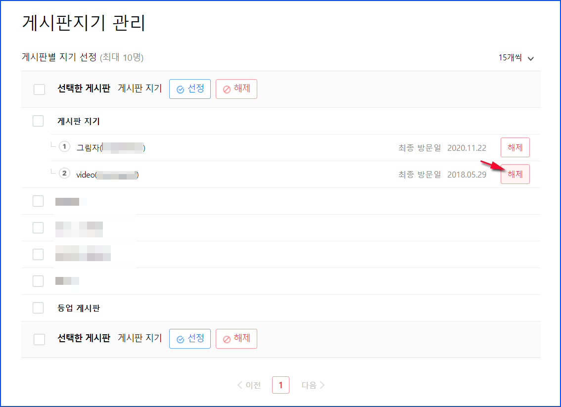 게시판 지기로 선정된 회원 닉네임 오른쪽에 있는 [해제]를 클릭하면 됩니다.