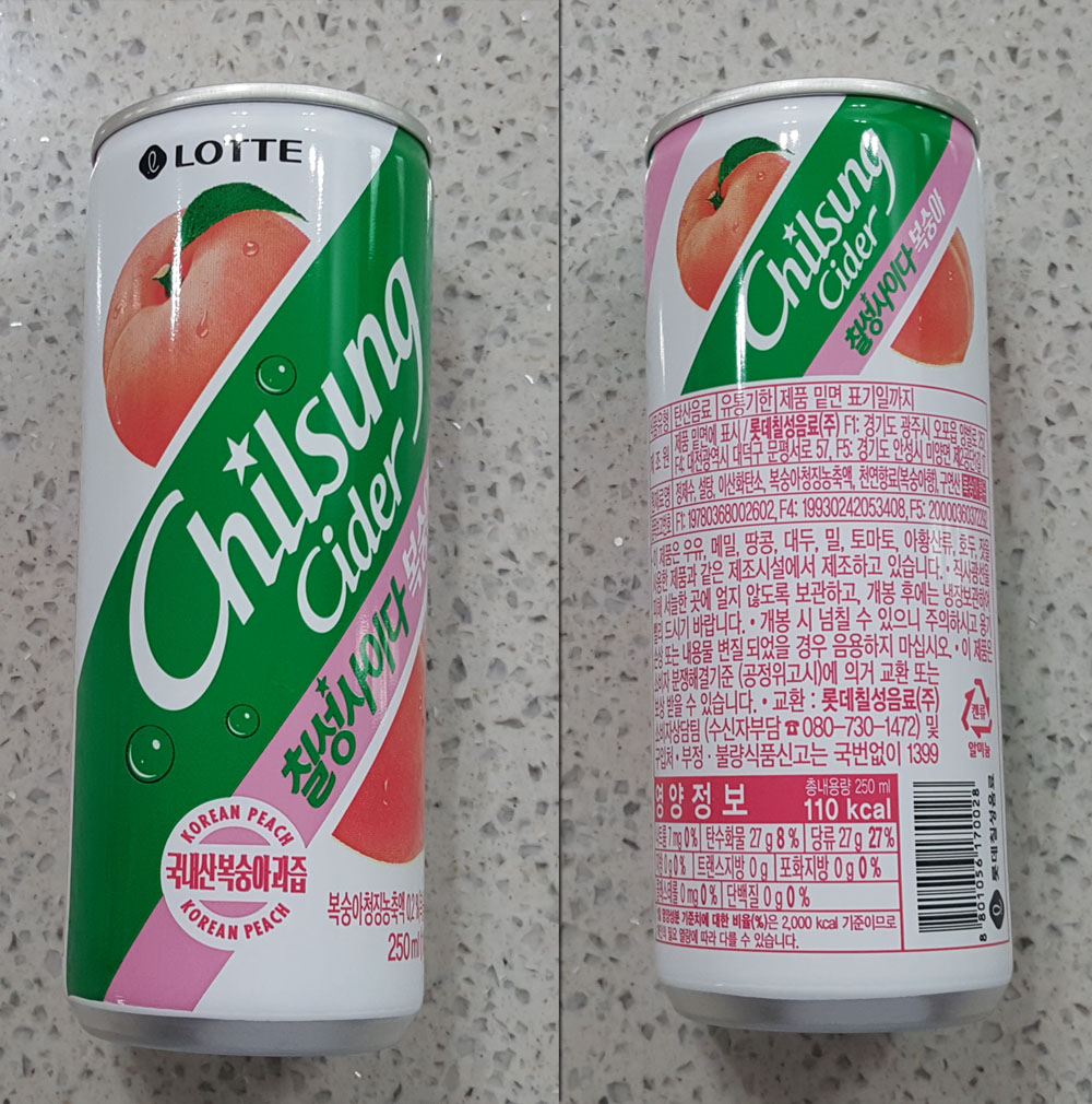 칠성사이다 복숭아 캔 내용량 및 열량, 원재료 및 영양정보, 제조원, 품목보고번호, 칠성사이다 복숭아 탄산음료 유통기한