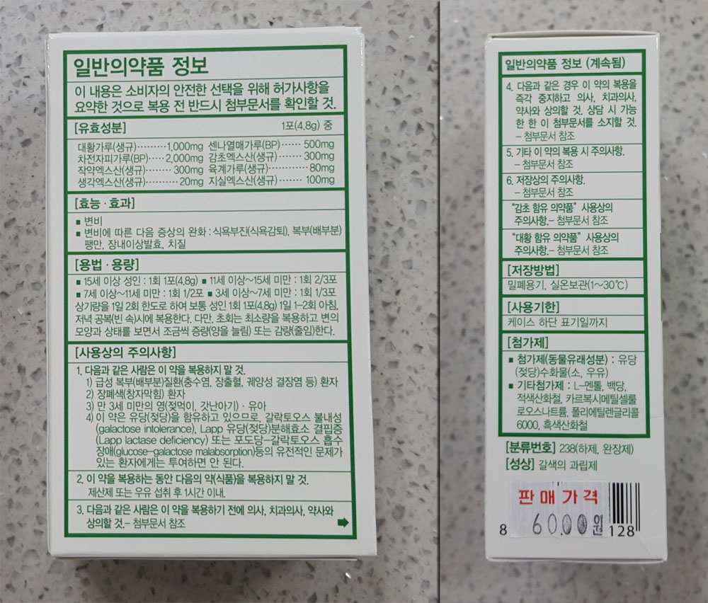약국을 방문해 노인에게 부담없는 변비약을 달라고 했더니 이 약을 줬고,