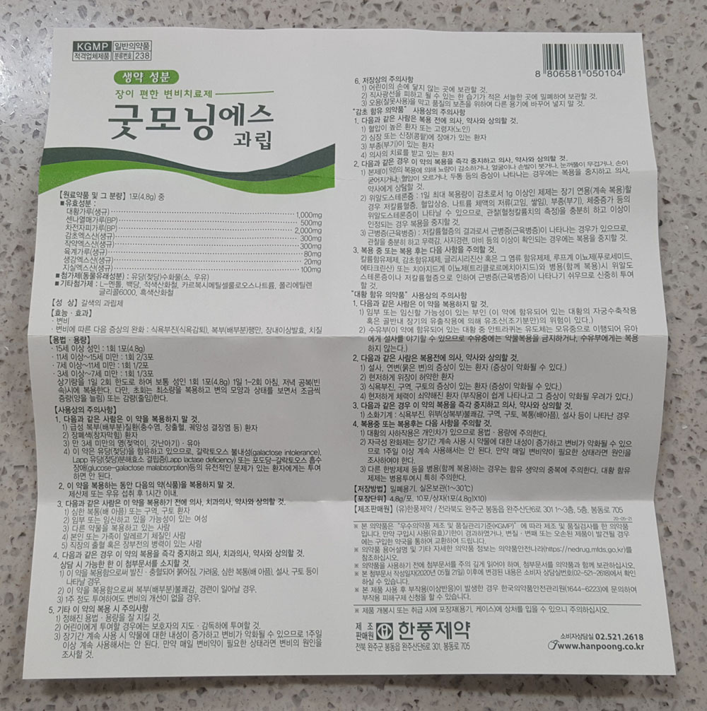 변비치료제 굿모닝에스 과립 가격, 성분, 첨가제, 제조 판매원, 사용기한, 효능 및 복용법, 주의사항 外