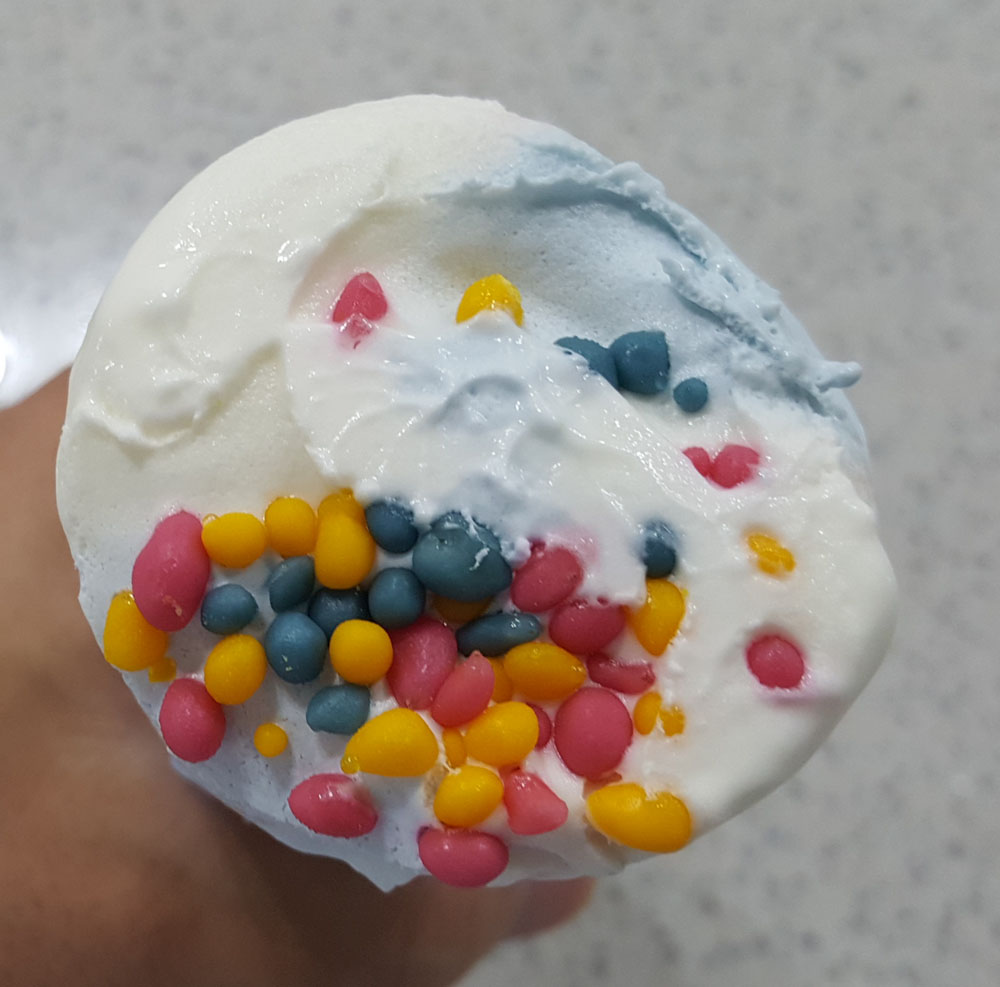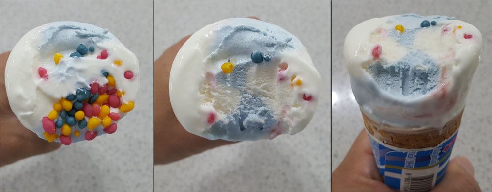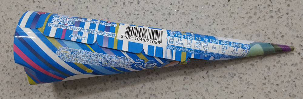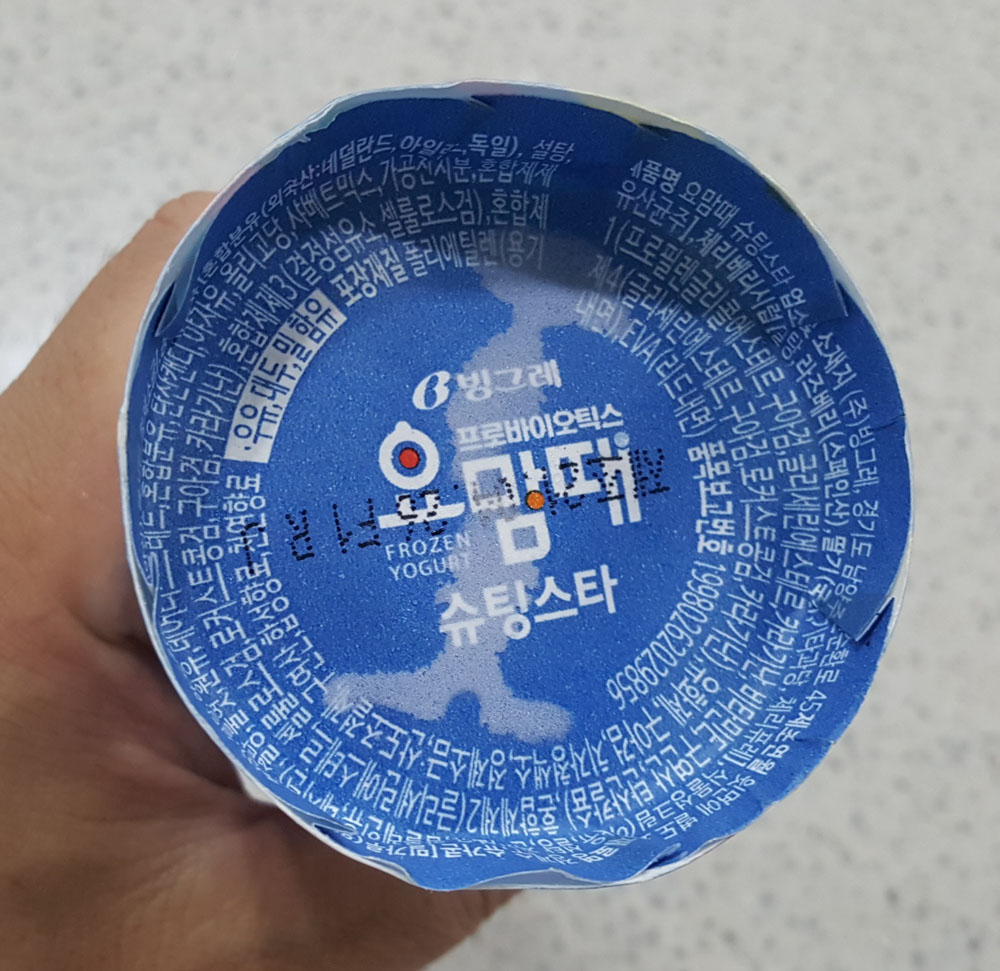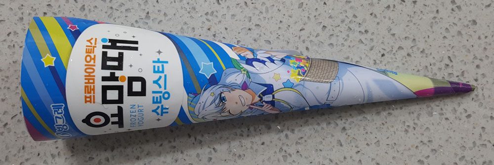 빙그레 요맘때 슈팅스타는 제품 설명에 있는 것처럼 유산균이 함유된 얼린 요구르트(FROZEN YOGURT)에 가까운 콘 아이스크림으로, (조금 녹은 상태에서 먹었기 때문인지) 다른 콘 아이스크림에 비해 식감과 맛이 부족하게 느껴지는 아이스크림이었습니다.