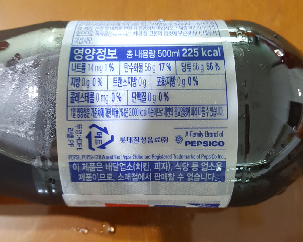 업소용 펩시 콜라 (PEPSI) 500 ml (225 kcal), 품목보고번호, 제조원, 원재료 및 영양정보, 펩시 콜라 유통기한