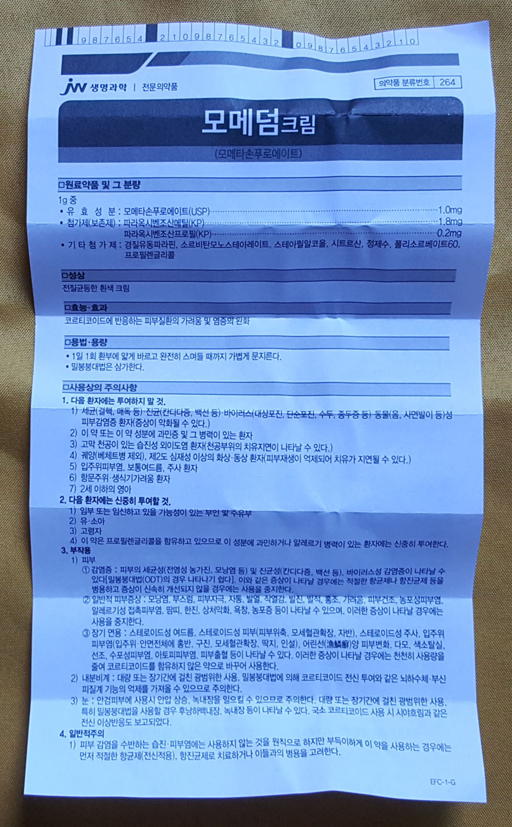 아래에 있는 내용은 JW 생명과학의 피부 질환 치료제 모메덤 크림에 관한 정보로, 해당 제품 포장과 내부 문서에 있는 내용을 발췌한 것입니다.