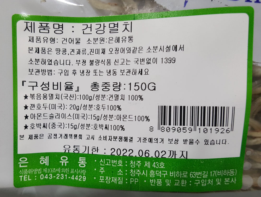 은혜유통 건강멸치 (마른 멸치) 중량 및 제품 구성 ... 멸치, 호두, 아몬드 등... 유통기한, 보관 방법
