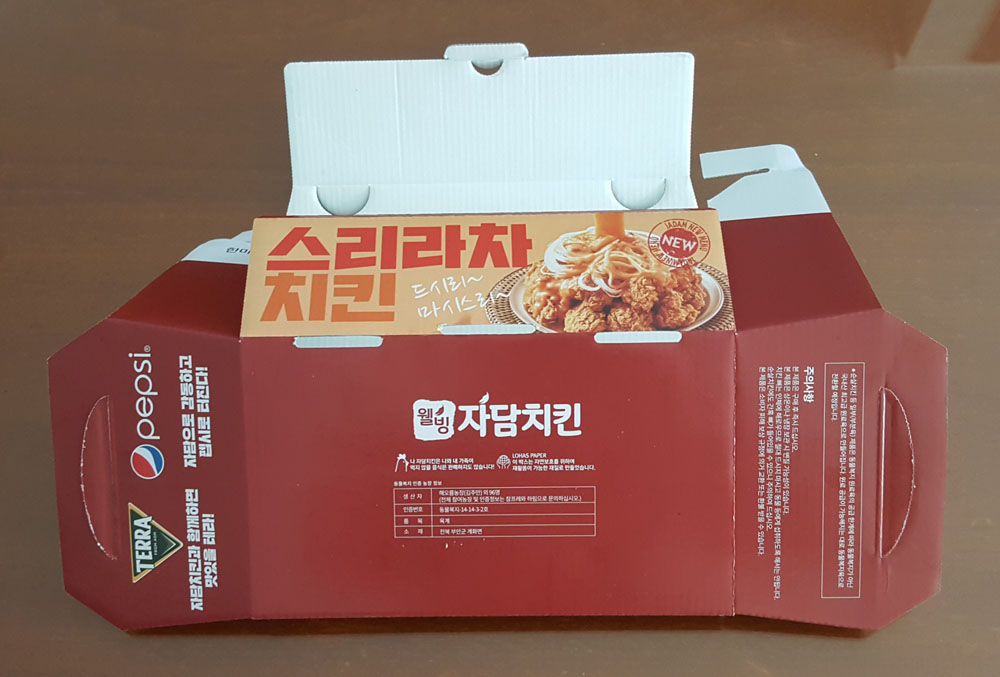 아래에 있는 것은 자담치킨 스리라차치킨 '치킨 포장 용기'에 인쇄된 내용의 일부를 요약, 발췌한 것으로, 해당 내용을 통해 자담치킨과 자담치킨 재료 등에 관한 정보를 조금이나마 알 수 있을 것입니다.