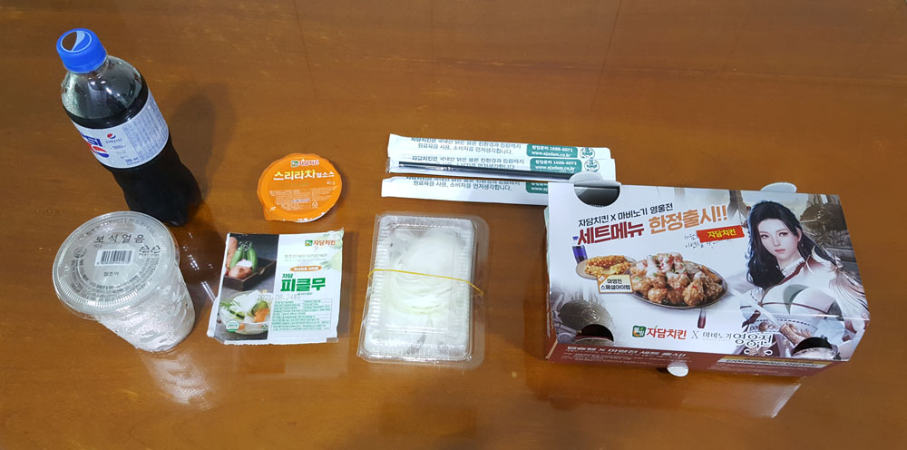 치킨과 함께 자담 피클무(220g), 스리라차 딥소스(40g), 보석얼음(160g), 펩시 콜라 업소용(500ml), 아주 가늘게 채 썬 양파, 나무젓가락 (3개), 플라스틱 빨대,