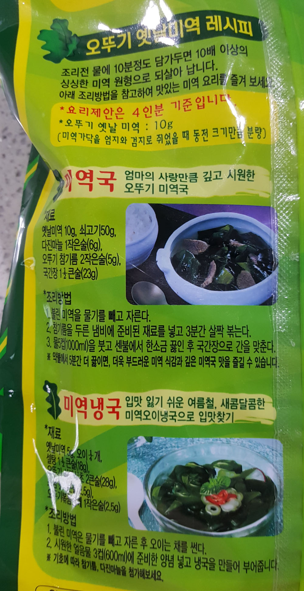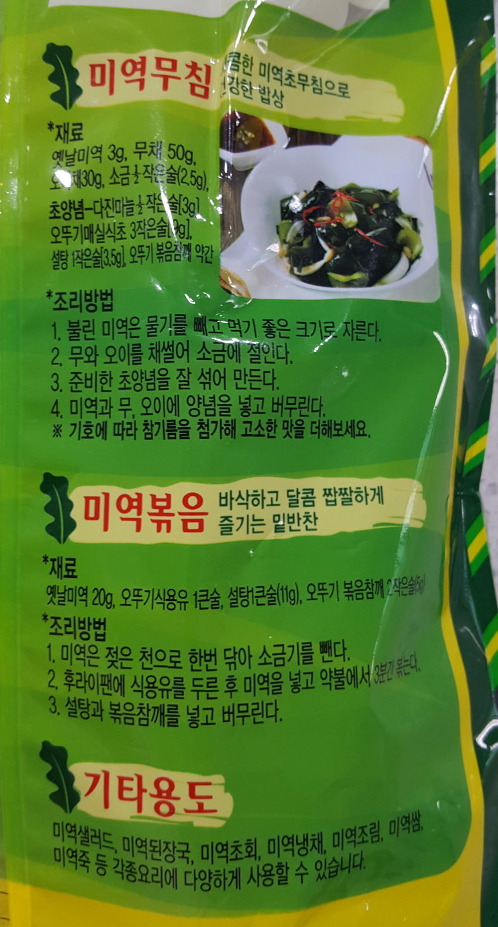 오뚜기 옛날미역 레시피(미역국, 미역냉국, 미역무침, 미역볶음 등)는 제품 포장에 인쇄된 내용을 참고하면 됩니다.