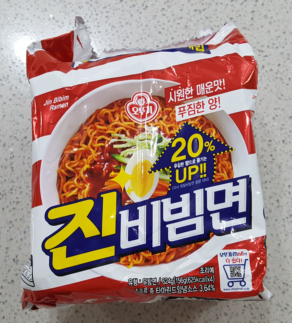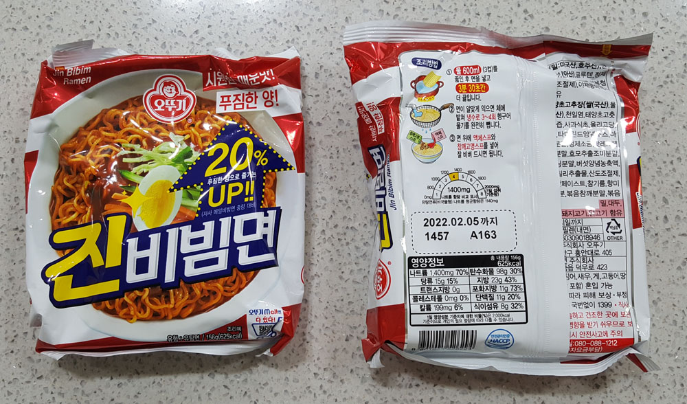 아래에 있는 것은 양이 20% 늘어난 오뚜기 진비빔면에 관한 내용으로, 제품 포장에 인쇄된 내용을 옮겨왔습니다.
