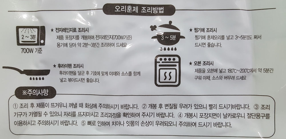 오리훈제 조리방법은 제품 포장에 인쇄된 내용을 참고하면 됩니다.