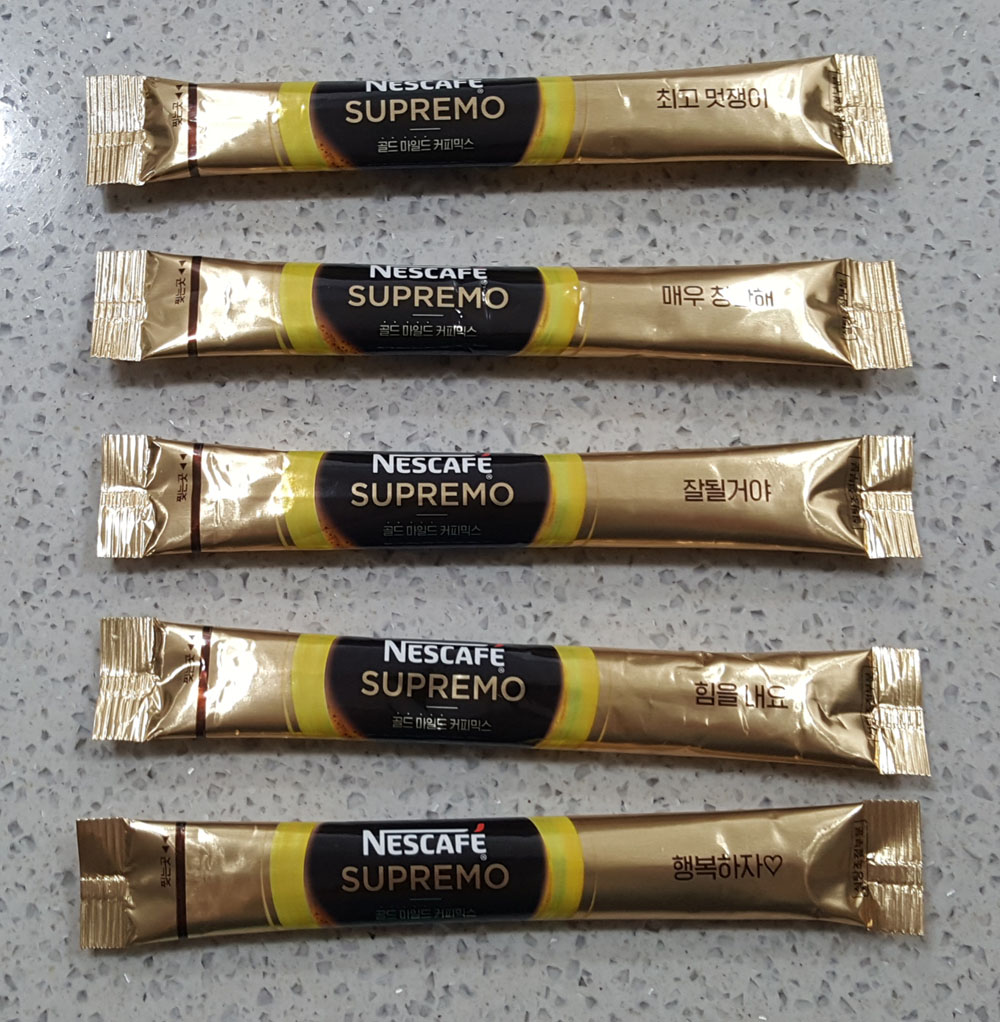 '네스카페 수프리모 골드 마일드 커피믹스' 스틱에는 '매우 칭찬해', '잘될거야', '힘을 내요', '행복하자♡' 같은 글자가 인쇄되어 있는데, 커피믹스를 건네면서 마음을 전하는 것도 재미있을 것입니다.