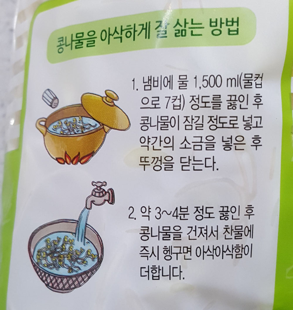 ▼ 제품 포장 인쇄물에 '콩나물을 아삭하게 잘 삶은 방법'에 관한 내용도 있으니 참고하면 도움이 될 것입니다.