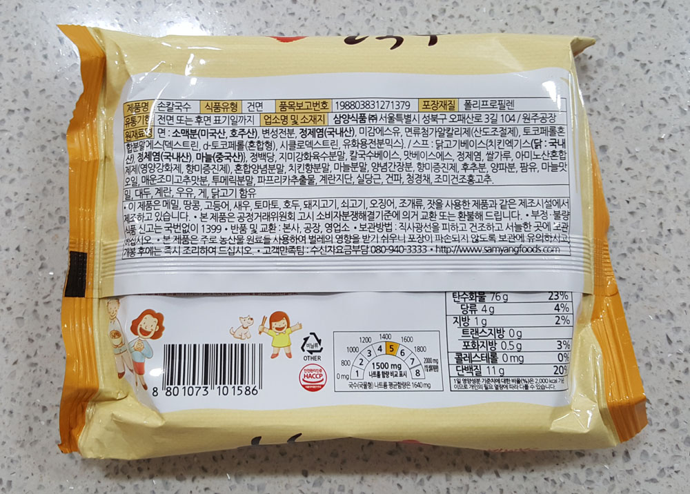 - 스프 : 닭고기베이스 {치킨엑기스 (닭: 국내산), 정제염 (국내산), 마늘 (중국산)}, 정백당, 지미강화육수분말, 칼국수베이스, 맛베이스에스, 정제염, 쌀가루, 아미노산혼합제제 (영양강화제, 향미증진제), 혼합양념분말, 치킨향분말, 마늘분말, 양념간장분, 향미증진제, 후추분, 양파분, 팜유, 마늘맛오일, 매운조미고추맛분, 투메릭분말, 파프리카추출물, 계란지단, 실당근, 건파, 청경채, 조미건조홍고추