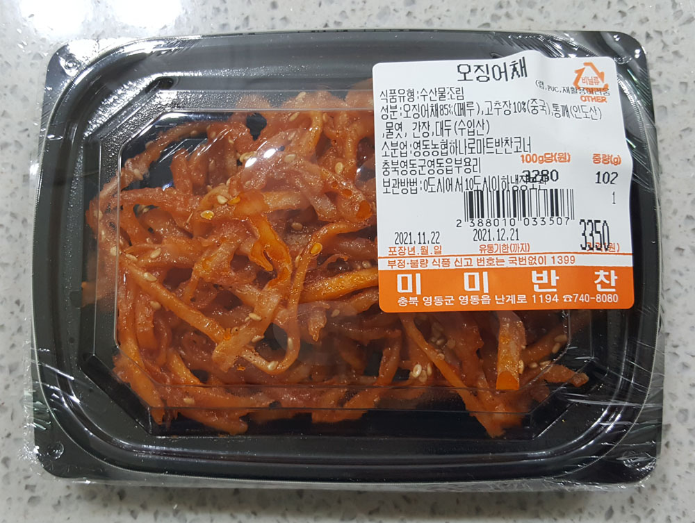 성분 : 오징어채 85% (페루), 고추장 10% (중국), 통깨 (인도산), 물엿, 간장, 대두 (수입산)