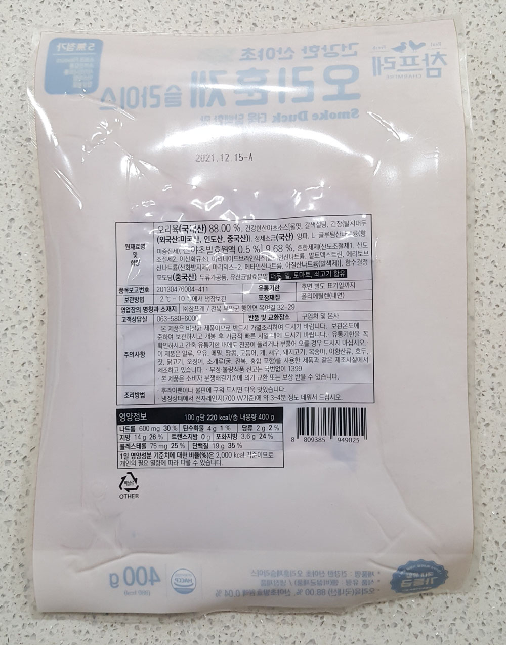참프레 건강한 산야초 오리훈제 슬라이스 400g 칼로리, 가격, 원재료 및 영양정보, 오리훈제 슬라이스 유통기한 外
