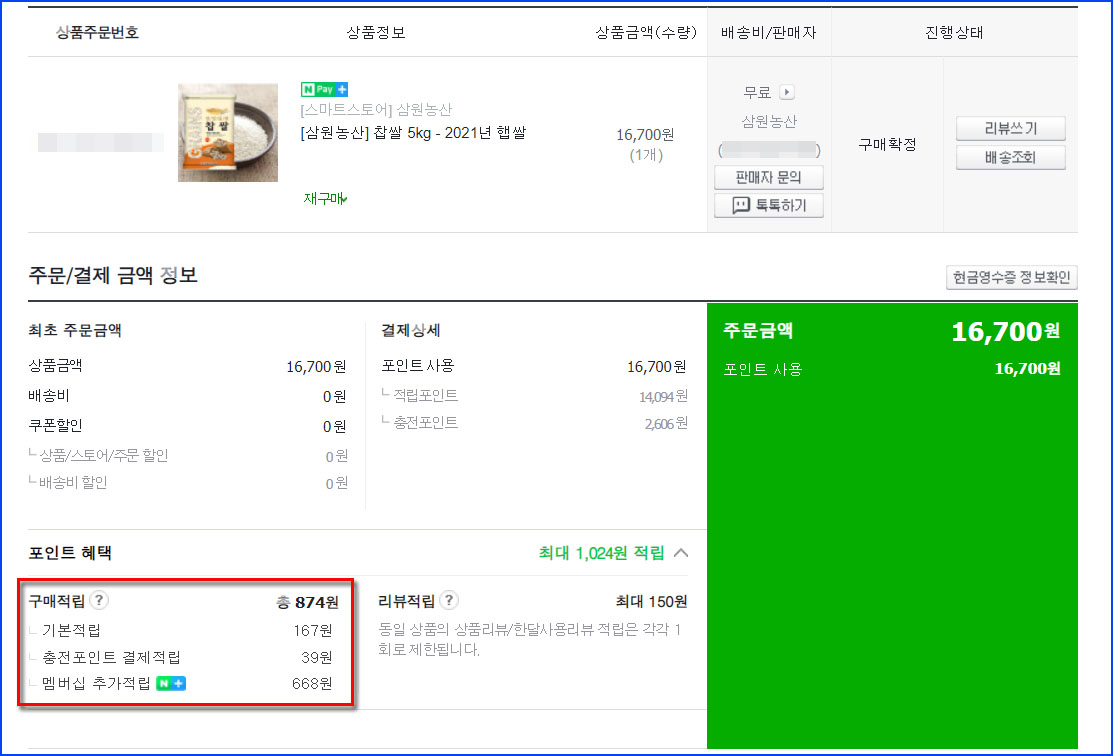 가격, 제품 사진이나 설명, 구매자들의 리뷰 등을 참고해 선택한 찹쌀은 삼원농산의 찹쌀(5kg, 2021년 햅쌀)로, 11번가에서 판매되는 삼원농산 찹쌀 가격이 최저가에 가까웠지만 네이버쇼핑에서 구매할 때 적립되는 네이버페이 포인트를 생각하면 별로 차이가 없어 네이버쇼핑에서 구매했습니다.