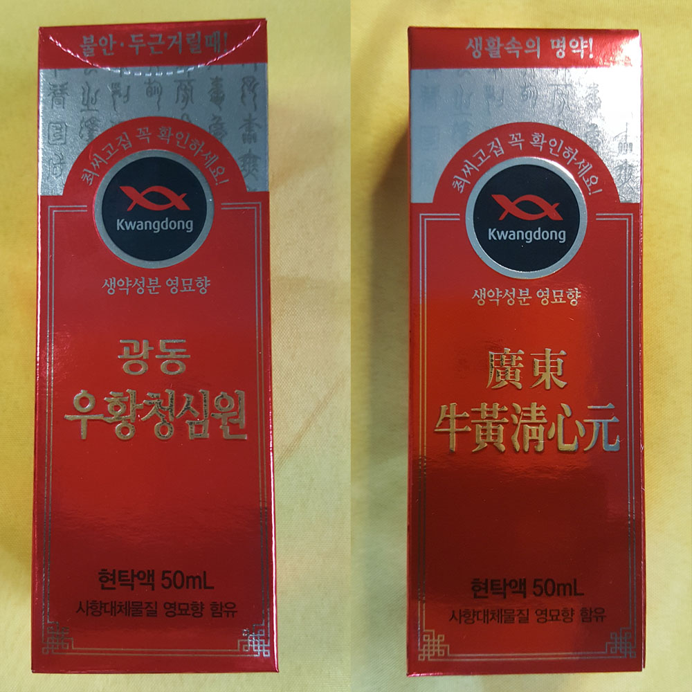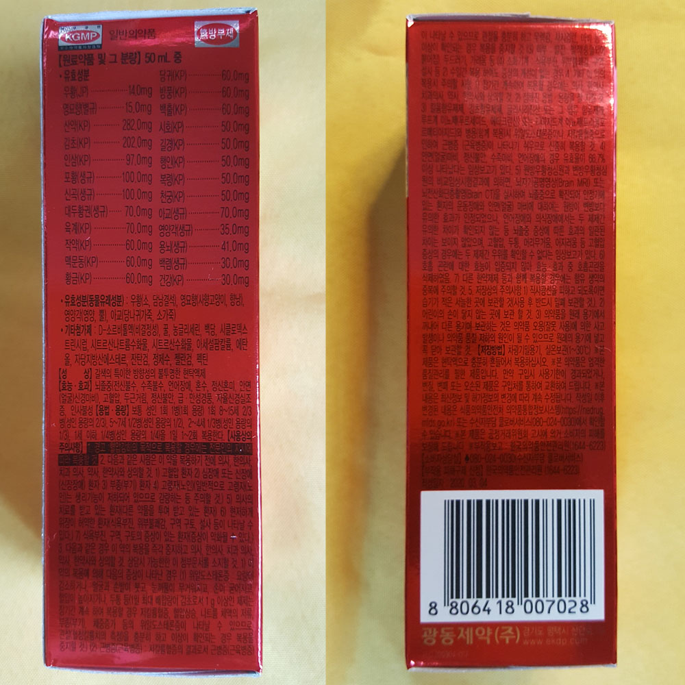 아래에 있는 내용은 광동 우황청심원 (廣東 牛黃淸心元) 액제 (현택액) 50ml에 관한 정보로, 포장 박스에 있는 내용을 그대로 옮겨온 것입니다.