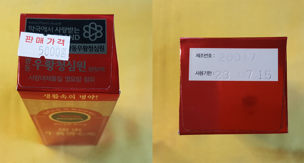 가격 : 5,000원 (2021년 12월) - 10,000원에 판매되는 광동 우황청심원은 5,000원에 판매되는 광동 우황청심원보다 우황이 3배 정도 많다고 합니다. 다른 제약사의 우황청심원도 여러 종류가 있었습니다.