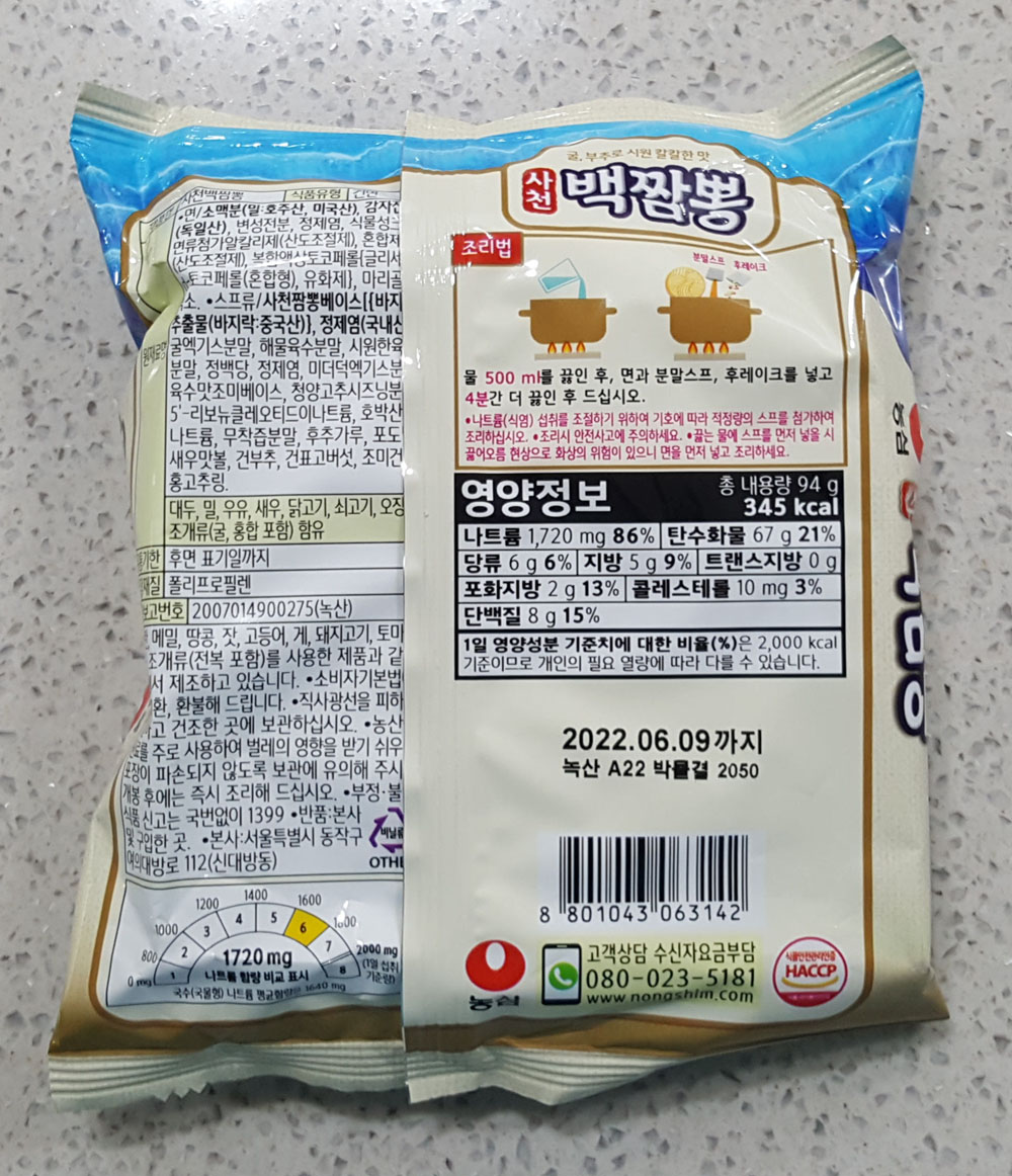 농심 사천 백짬뽕 중량 (내용량), 원재료 및 영양정보, 사천 백짬뽕 유통기한 外