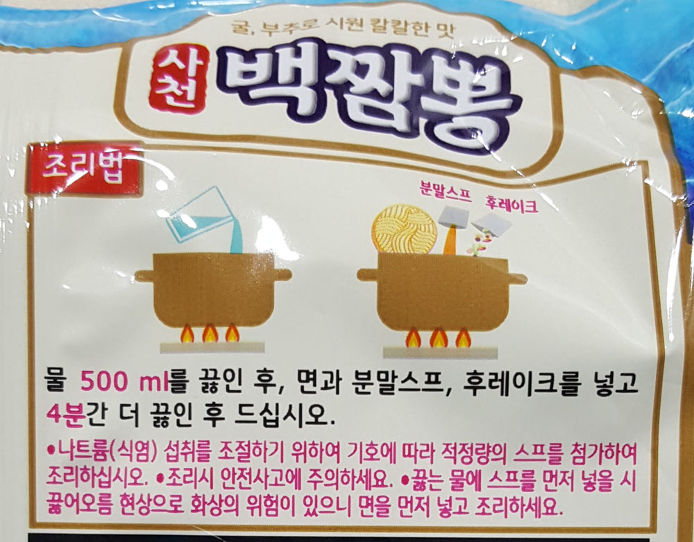 사천 백짬뽕은 끓는 물에 면과 분말스프, 후레이크를 함께 넣고 4분 정도 끌이면 됩니다.