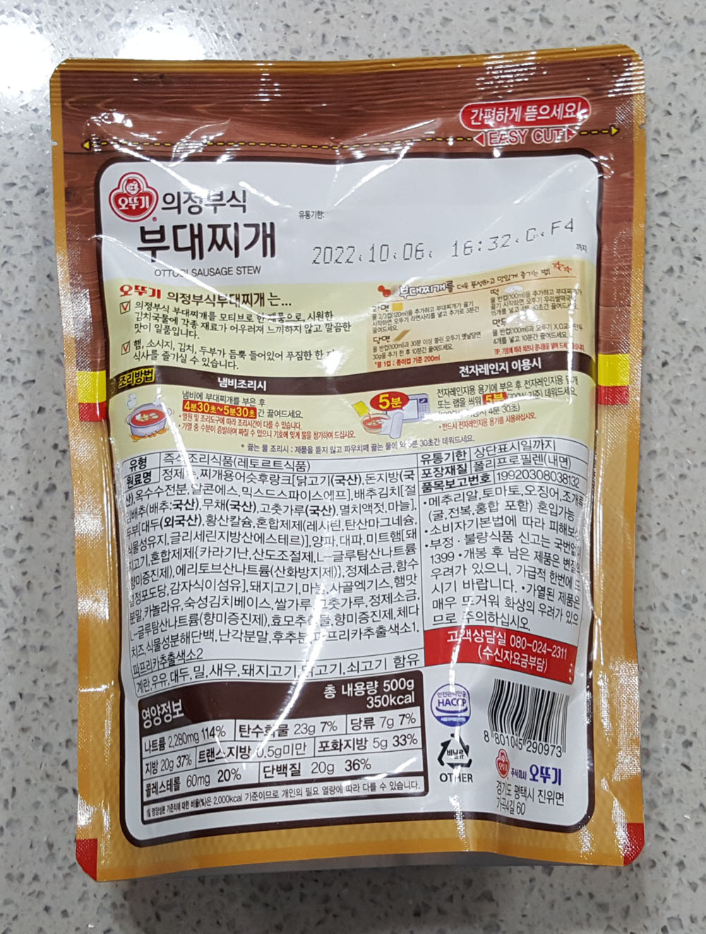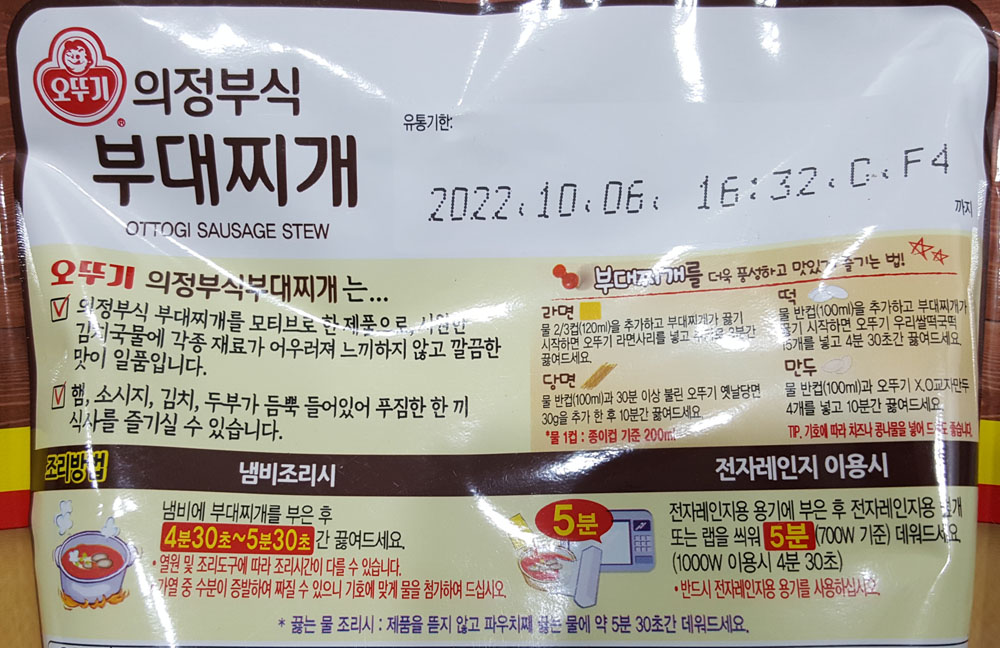 오뚜기 의정부식 부대찌개 내용량, 가격, 원재료 및 영양정보, 유통기한, 품목보고번호, 조리 시간 外