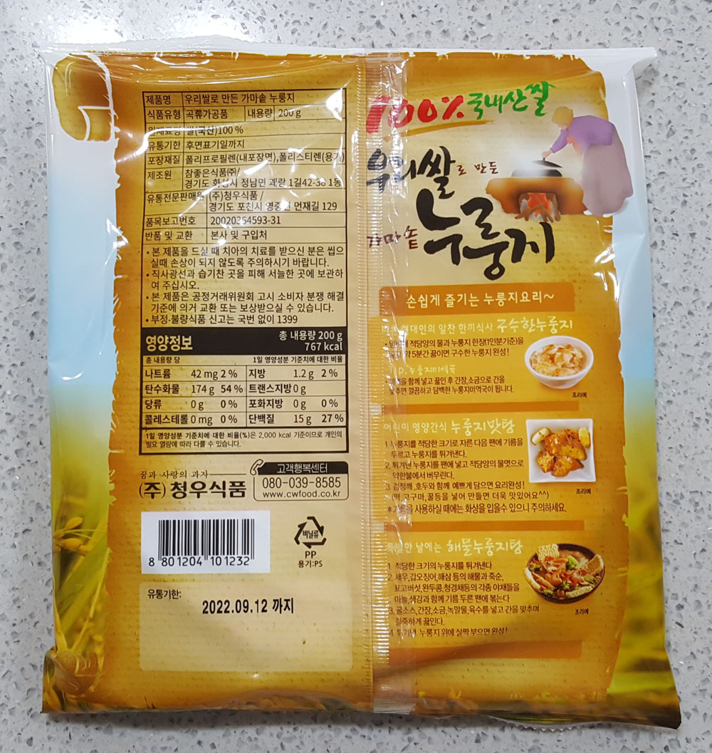 CW 청우 우리쌀로 만든 가마솥 누룽지 중량, 가격, 영양정보, 누룽지 유통기한 및 요리법 中
