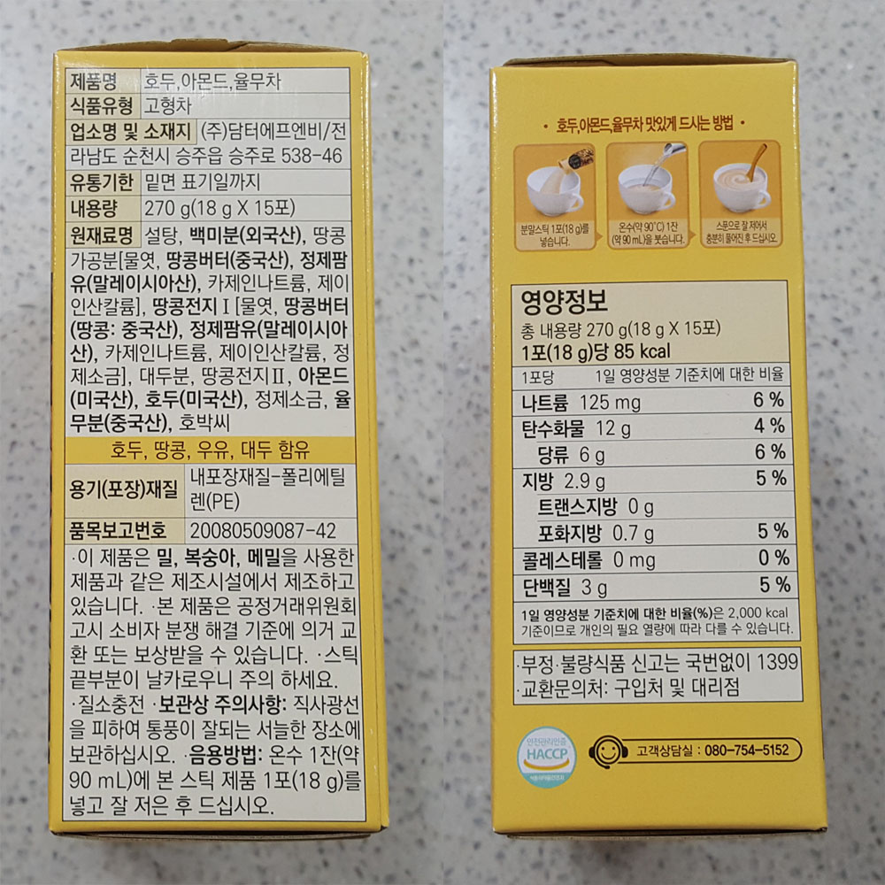 담터 호두, 아몬드, 율무차 내용량, 품목보고번호, 원재료 및 영양정보, 유통기한 外