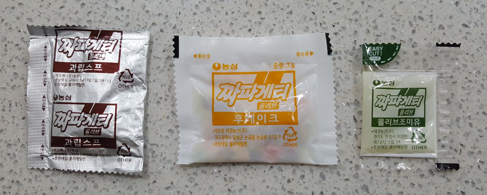 - 스프류 : 분말짜장, 정백당, 짜장베이스분말, 분말카라멜2호 (카라멜색소, 물엿분말), 짜장베이스, 분말카라멜3호 (카라멜색소, 물엿분말, 효소처리스테비아), 야채오일분말, 볶음조미소맥분, 볶음조미옥수수분, 볶음조미감자분, 정제염, 볶음양파분, 발효사과분말, 5'-리보뉴클레오티드이나트륨, 조미짜장분말, 조미대두단백, 건양배추, 튀김감자다이스, 튀김양파, 건당근, 양파풍미유, 짜장풍미유, 혼합올리브유 (스페인산), 양파조미유
