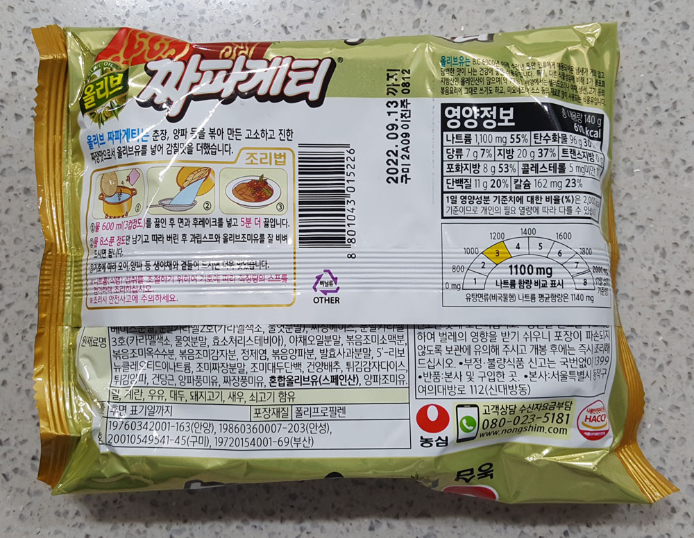 농심 올리브 짜파게티 멀티팩 (5개입) 가격, 품목보고번호, 원재료 및 영양정보, 유통기한 外
