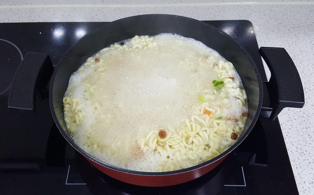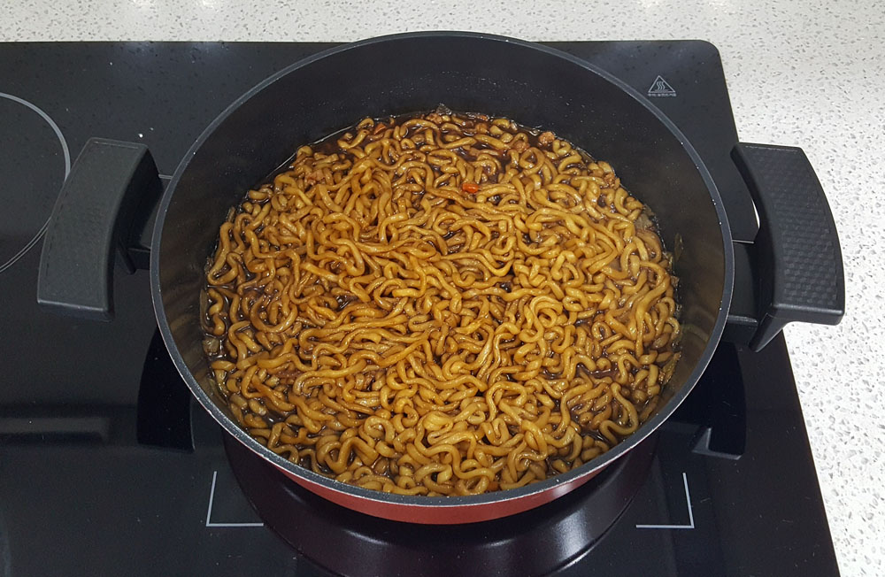 농심 올리브 짜파게티를 조리할 때 물을 부족하지 않게 충분히 넣어 면을 끓입니다.