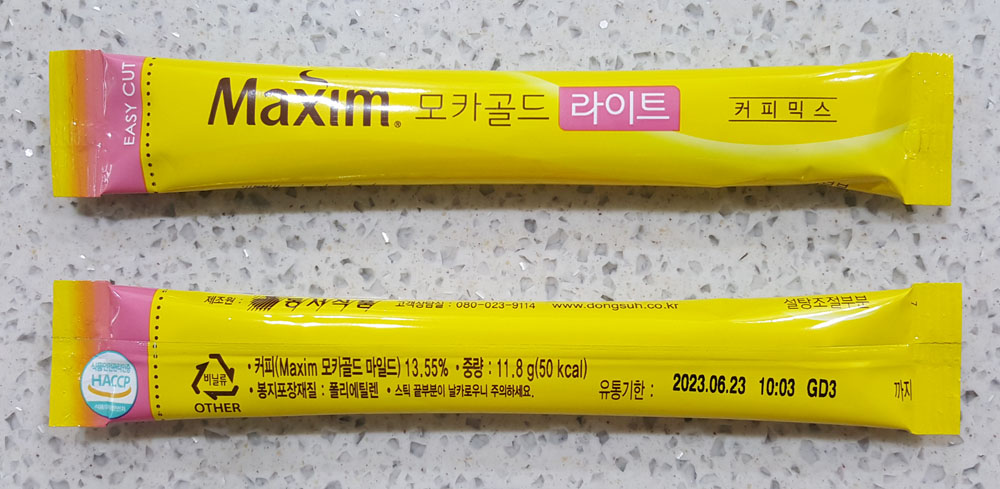 - 사용기준 : Maxim 모카골드 라이트 커피믹스 1봉지 (11.8 g)를 잔에 넣고 뜨거운 물을 적당량 (90~100 ml) 부어 완전히 용해한 후 음용하십시오.