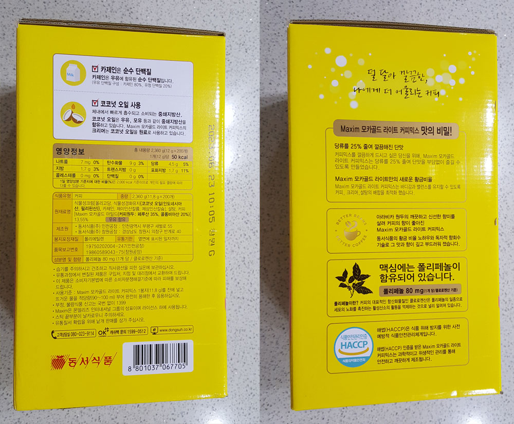 식물성크림 [올리고당, 식물성경화유지 {코코넛 오일 (인도네시아산, 필리핀산)}, 카제인, 제이인산칼륨, 제삼인산칼슘], 설탕, 커피 [Maxim 모카골드 마일드 (커피원두: 페루산 35%, 콜롬비아산 20%)] 13.55%