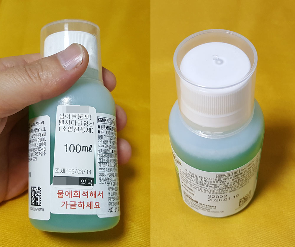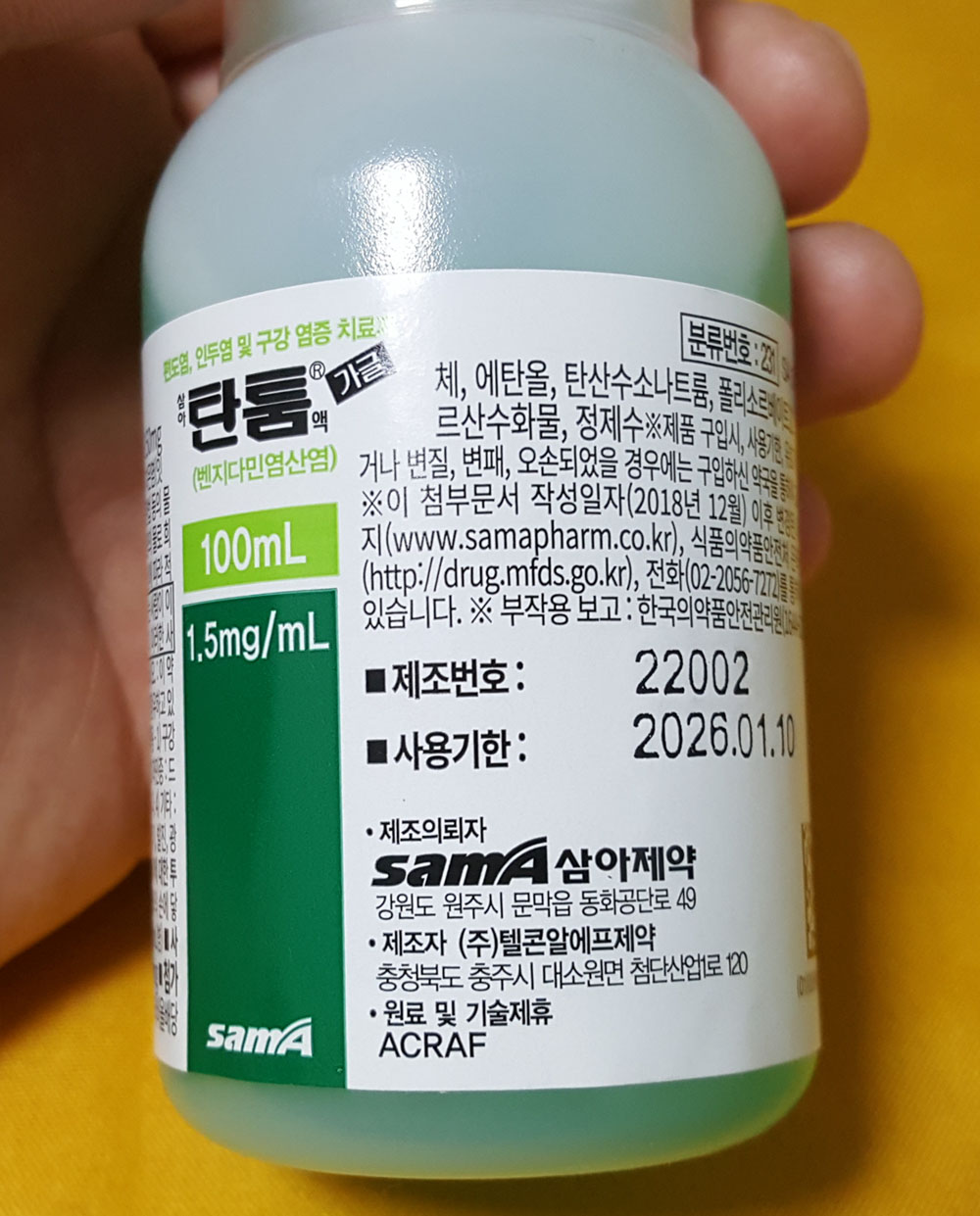 아래에 있는 것은 2022년 3월 14일 코로나19 확진 판정을 받은 후 처방받은 약 중 하나인 삼아탄툼액 (벤지다민염산염)에 관한 정보로, 제품 포장에 있는 내용을 그대로 옮겨온 것입니다.