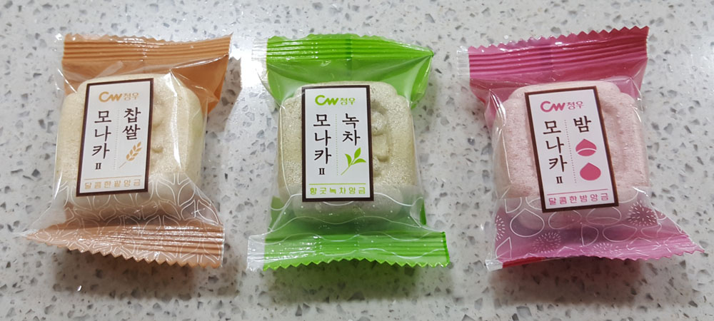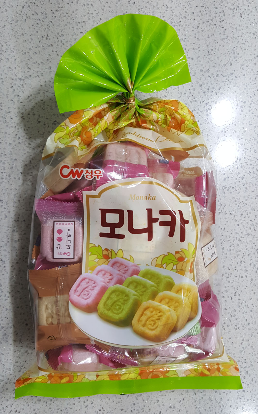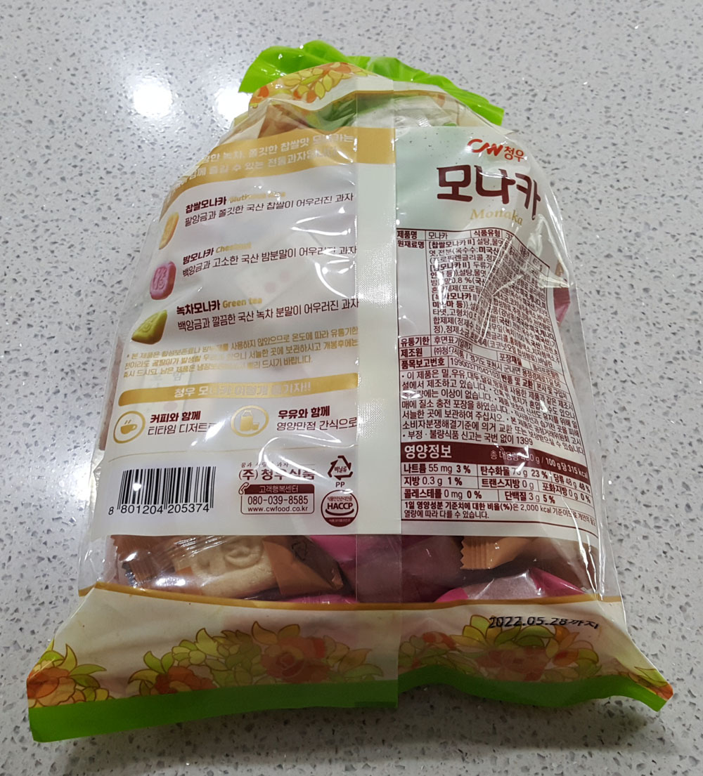 청우식품에서 만들어 판매하는 모나카에는 찹쌀모나카, 밤모니카, 녹차모나카 3종류가 들어 있습니다.