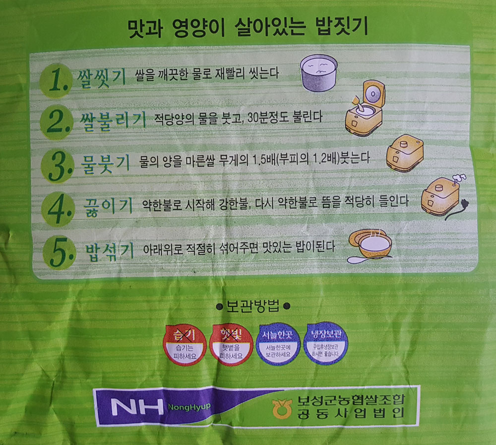 쌀 포대에 인쇄된 밥짓는 방법, 쌀 보관방법 등을 참고하면 도움이 될 것입니다.