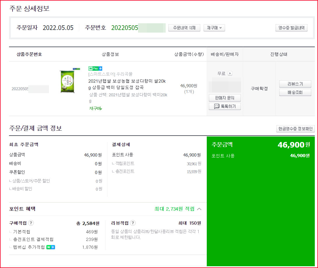 - 네이버페이 포인트 2,584원을 적립받았으니 45,000원도 안되는 가격으로 괜찮은 품질의 쌀 20kg을 구매한 셈입니다.