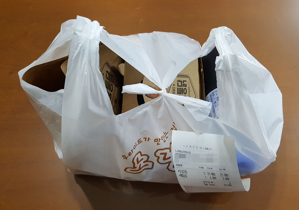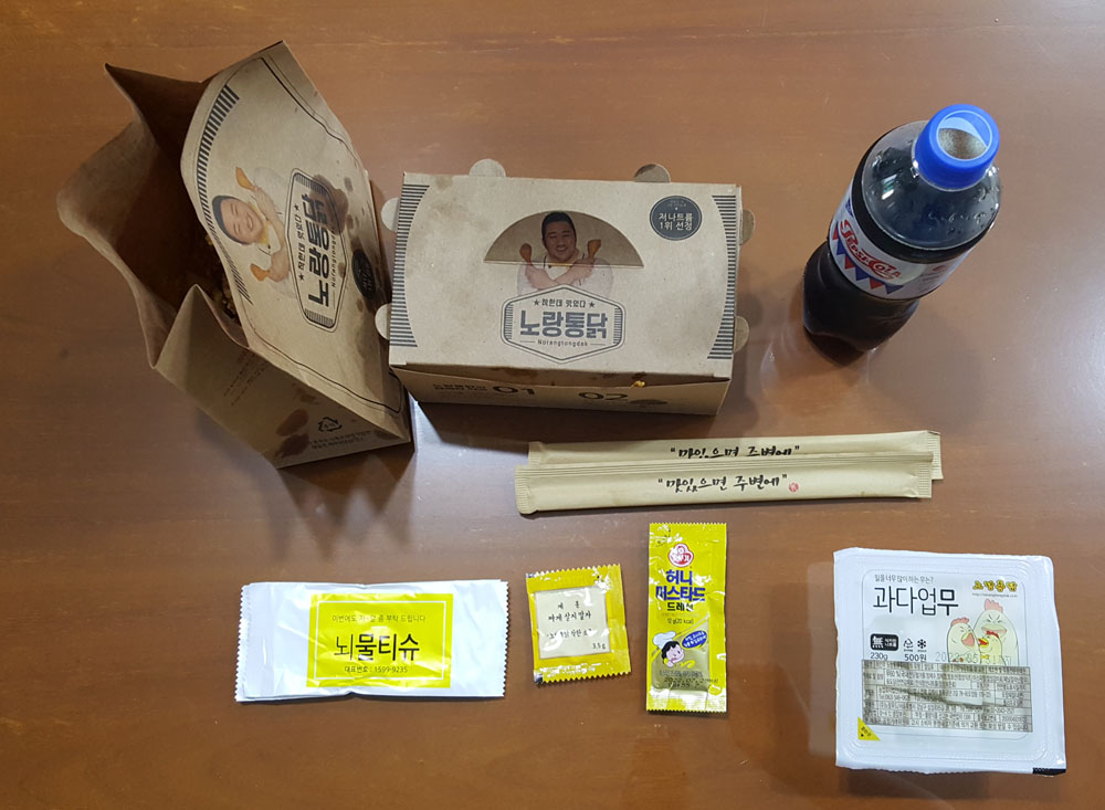 '노랑통닭 순살 3종 세트' 메뉴의 내용물로는 펩시 콜라 업소용(500ml), 노랑통닭 치킨무(230g), 노랑통닭 착한 소금(2.5g), 오뚜기 허니머스타드 드레싱(12g), 업소용 하이물휴지(2개), 나무젓가락(2개)이 있는데, 치킨무에는 '과다업무', 물티슈에는 '뇌물티슈'(치킨에 이 한 몸 바친다 제물티슈, 이번에도 자~알 부탁 드립니다 뇌물티슈), 소금에는 '계훈: 짜게 살지 말자' 같은 재치있는 글이 인쇄되어 있어 신선한 재미를 느낄 수 있었습니다.