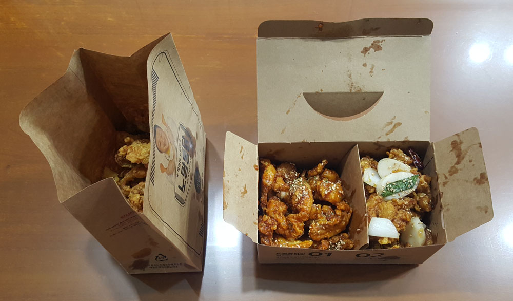 '노랑통닭 순살 3종 세트'는 예전에 먹었던 '자담치킨 3반순살치킨세트 Set 2(순살반 + 양념순살반 + 간장순살반)'와 비교해 육질이나 맛 등에서 부족함이 많이 느껴지는 순살치킨입니다.