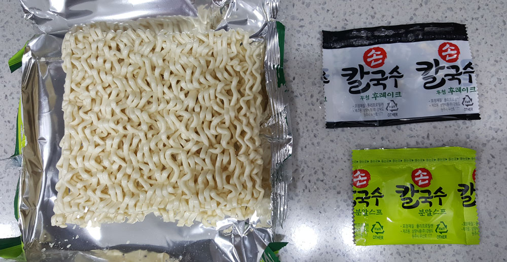 - 스프 : 손칼국수베이스 [닭고기베이스 {치킨엑기스 (닭: 국내산), 칼국수베이스 (정제염: 국내산)], 정백당, 지미강화육수분말, 맛베이스에스, 정제염, 혼합양념분말, 변성전분, 마늘분말, 양념간장분, 흑후추분말, 대두유, 양파분, 파프리카추출물, 마늘맛오일, 매운조미고추맛분, 구운김후레이크, 건파, 계란지단, 볶음참깨