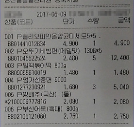 김천농협 하나로마트 2017년 6월 9일 금요일 구매 내역 1. 클리오 파인올-R 칫솔 (5+5) : 4,900원 2. 오뚜기 메밀비빔면 멀티 (5개입) : 2,480원 멀티 수량 5개 : 12,400원 3. 까치표 밀떡볶이(떡) 800g : 1,480원 4. 농협하나로 쫄깃 국수 중면 900G : 1,680원 수량 3개 : 5,040원 5. 양배추 (국산) 1통 : 2,080원 6. 해뜨락 부산어묵 800g : 2,750원 총구매액 : 28,650원 ※ 계란 한 판의 가격은 7,000원대 중후반이었습니다.