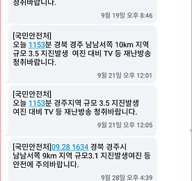 국민안전처, 기상청에서 발송된 긴급재난문자 - 경주지역 지진 발생 문자 (2016년 9월 12일부터 12월 14일까지) 아래 캡처 이미지는 2016년 9월 12일 밤 경북 경주시 남남서쪽 지역에서 발생한 5.8 규모의 지진 이후 제가 사는 지역(경북 김천시)에서 받은 긴급재난문자들입니다. 2016년 10월 10일 이후 발송된 긴급재난문자가 없었다가, 2016년 12월 12일과 12월 14일에 경주시 남남서쪽에서 3.3 규모의 지진이 발생했다는 문자가 (국민안전처가 아닌) 기상청에서 발송되었습니다. 대한민국 국민들에게 2016년은 엄청난 상실감과 수치심을 안겨준 한 해로, 한반도 사드 배치, 한일 위안부 합의, 한일군사협정, 국정교과서, 최순실 국정농단, 지진, AI 등 여전히 해결해야 할 많은 어려운 상..