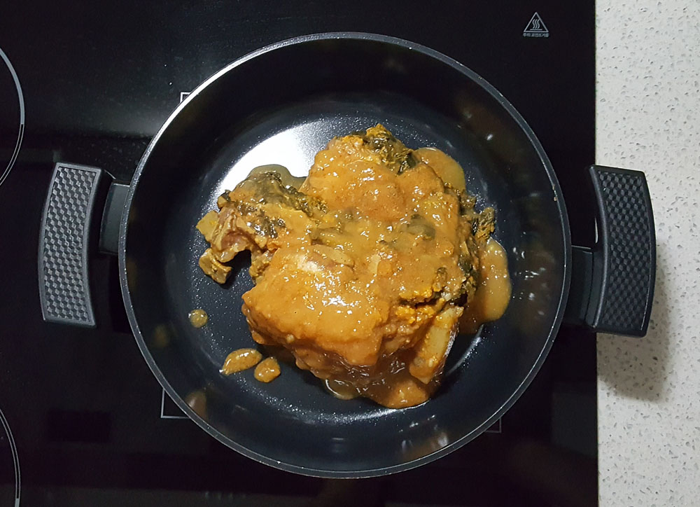 냄비에 누리마을 얼큰 감자탕을 넣고 물을 조금 부어서 조리해도 됩니다.