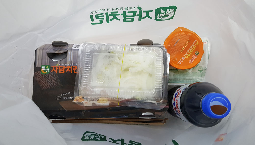 배달된 자담치킨 스리라차치킨에는 치킨과 함께 자담 피클무(220g), 스리라차 딥소스(40g), 펩시 콜라 업소용(500ml), 아주 가늘게 채 썬 양파, 나무젓가락(2개)이 내용물로 들어있었습니다.