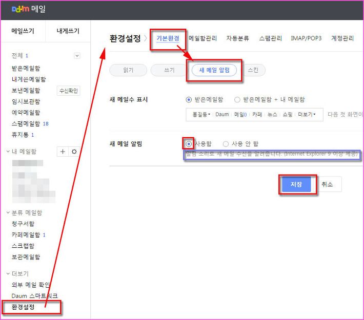 위와 같이 설정하면 자신의 다음 메일 메일함(편지함)에 새로운 이메일이 도착했을 때 알림 소리로 새 메일 수신을 알려주게 됩니다. (인터넷 익스플로러 8 이하 버전에서는 이 기능을 사용할 수 없습니다.)